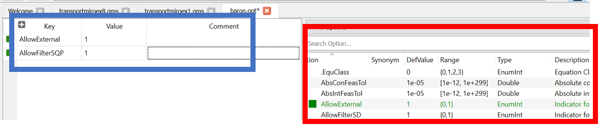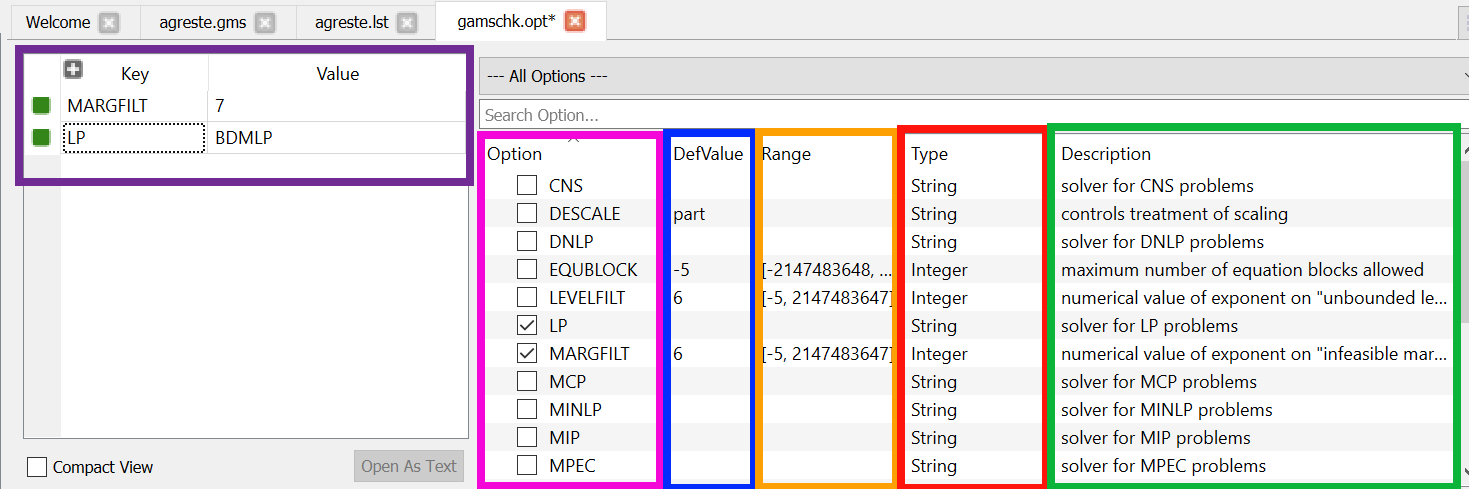 Once it opens the general format of the solve option editor is as follows. Note the specific content depends on the solver chosen and in this case I use GAMSCHK.